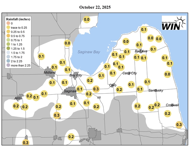 The rain map displays daily rainfall amounts. A user can hover the cursor over a rainfall value to yield the corresponding station name, and clicking on the rainfall value will display a table of daily temperature and rainfall totals. Daily rainfall data is calculated from the total accumulation of precipitation that falls from midnight to midnight.